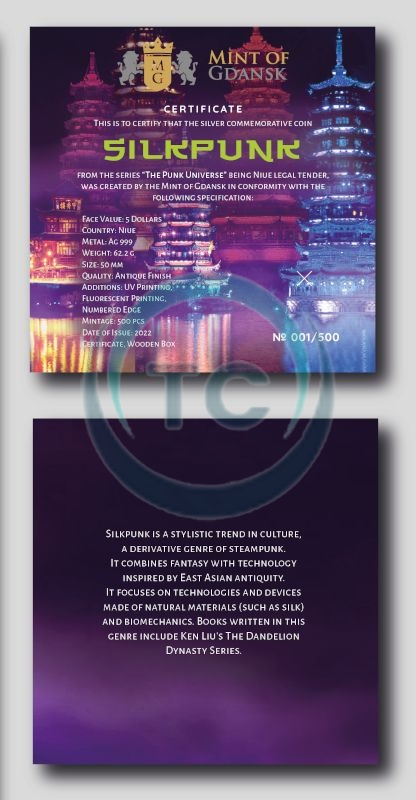 Silkpunk, gatunek, który łączy elegancję historycznej estetyki z intrygą futurystycznej technologii, zaprasza nas do eksploracji świata, w którym maszyneria parowa i dziedzictwo kulturowe współistnieją w harmonii. Kolekcja monet Niue 5 $ Silkpunk: The Punk Universe 2022 czerpie inspirację z tego urzekającego gatunku, wytwarzając monety, które nie tylko pobudzają wyobraźnię, ale także służą jako hołd dla piękna fuzji kulturowej.