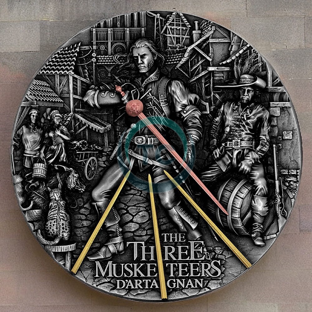 Rewers monety przedstawia szereg emblematycznych motywów związanych z Trzej muszkieterami. Skrzyżowane miecze, symbolizujące jedność i koleżeństwo, stoją dumnie pośrodku, otoczone misternymi rycinami przedstawiającymi elementy z opowieści, takie jak muszkiety, fleur-de-lis i motywy inspirowane francuską architekturą. Połączenie tych symbolicznych elementów tworzy urzekający wizualnie projekt, który naprawdę oddaje ducha powieści.