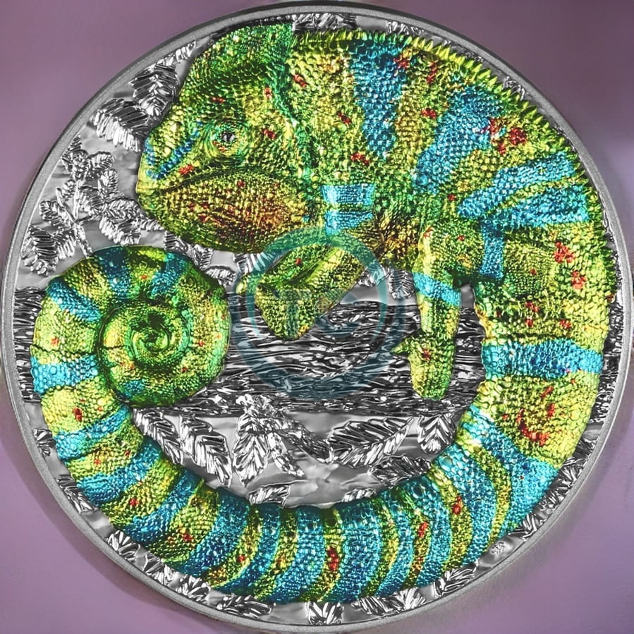 Moneta Niue Island 2023 – Chameleon 2 oz Silver HR zostanie wyemitowana w nakładzie 500 specjalnie uszlachetnionych sztuk wraz z Certyfikatem Autentyczności i autorskim opakowaniem.