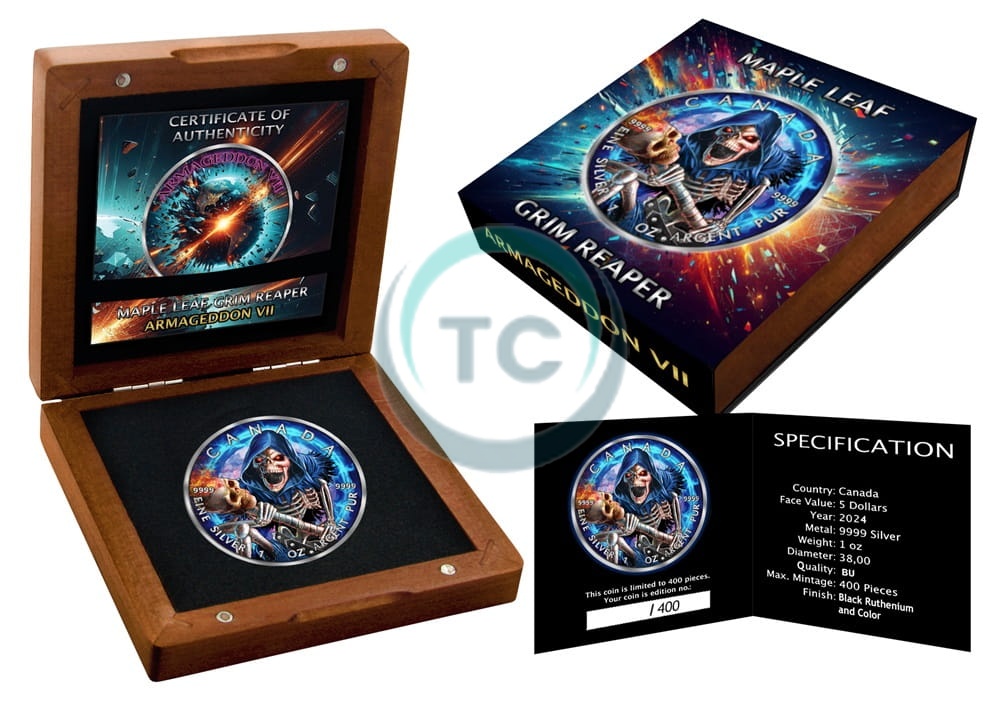 Kanadyjska seria Maple Leaf zajmuje szczególne miejsce w sercach kolekcjonerów i inwestorów. Znana ze swojej wyjątkowej czystości i nienagannego kunsztu, seria Maple Leaf stała się synonimem jakości i doskonałości. Dodanie projektu Grim Reaper Armageddon VI dodaje odrobinę tajemniczości i intrygi do tej już prestiżowej kolekcji.