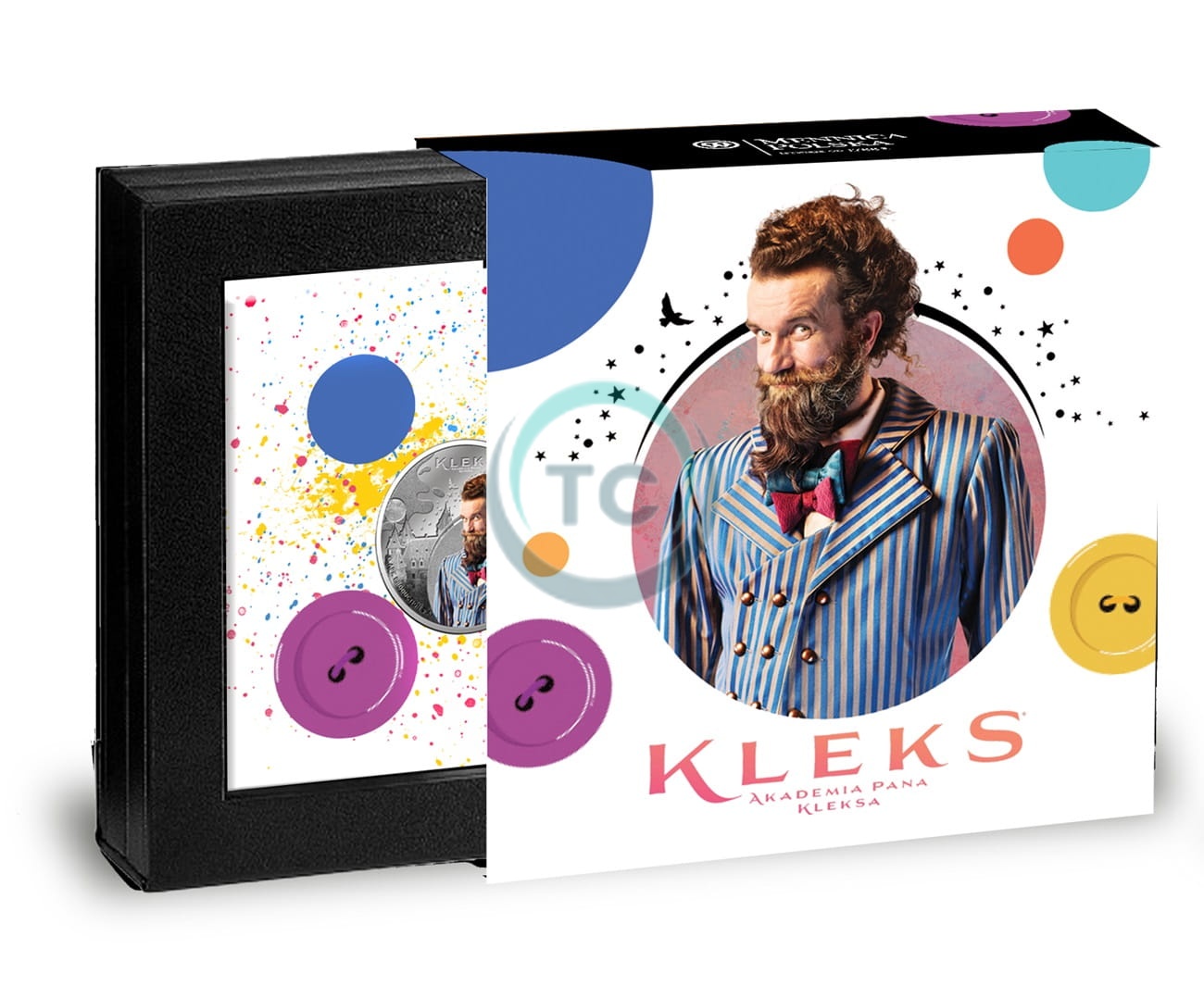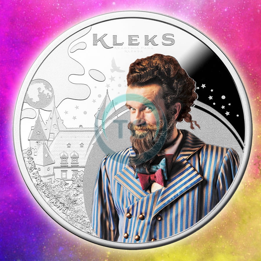 Centralnym elementem tej niezwykłej monety jest kolorowy portret Pana Kleksa, przedstawiony z charakterystyczną dla niego błyskotliwością i pomysłowością. Otacza go mikrodruk i matowanie laserowe, które tworzą delikatne, lecz wyraźne grafiki – gwizdki i motyle, subtelnie nawiązujące do magicznego świata przedstawionego w filmie. Budynek Akademii, ukazany w tle, stanowi hołd dla miejsca, gdzie rozgrywa się akcja filmu, a także dla samej kreatywności i wyobraźni, jakie symbolizuje ta postać.
