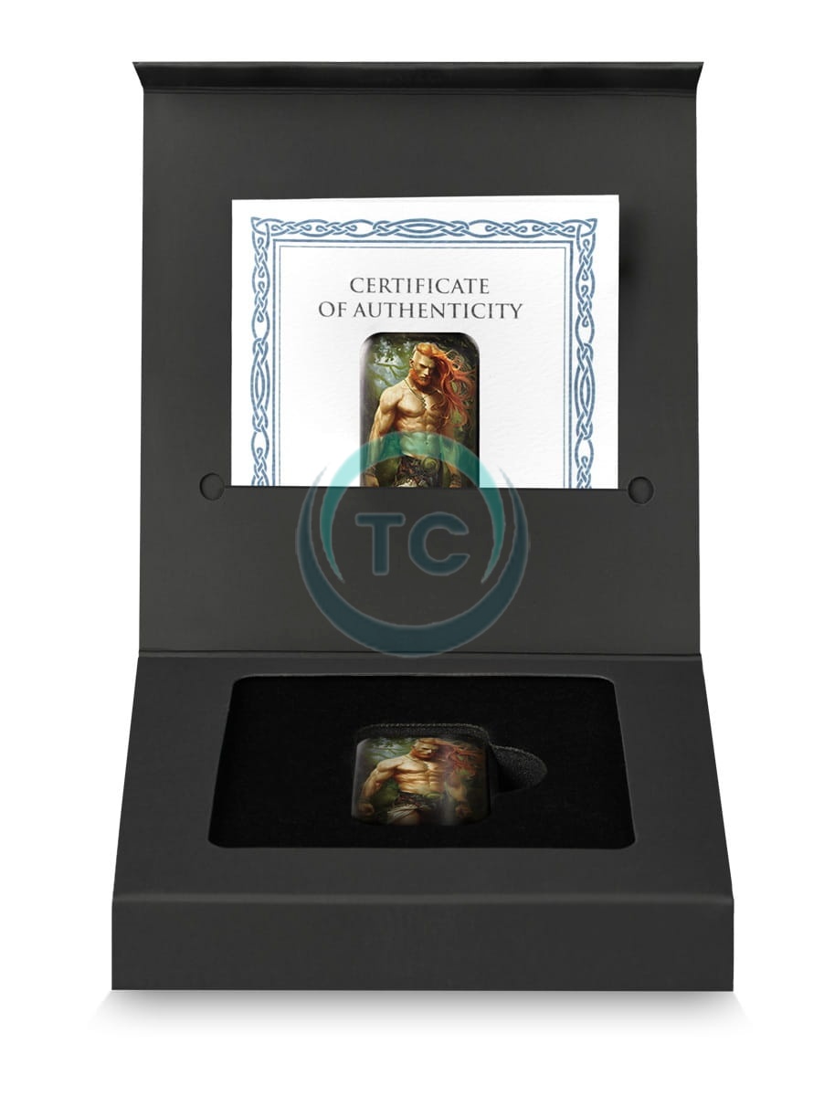 Elegancki, czarny kartonik zdobiony jest owijką ze stylizowanym wizerunkiem boga, co nadaje całości wyjątkowego charakteru. To opakowanie idealnie komponuje się z wysokiej klasy kolekcjonerskimi sztabkami, trafiając w gusta miłośników piękna i mitologii germańskiej.